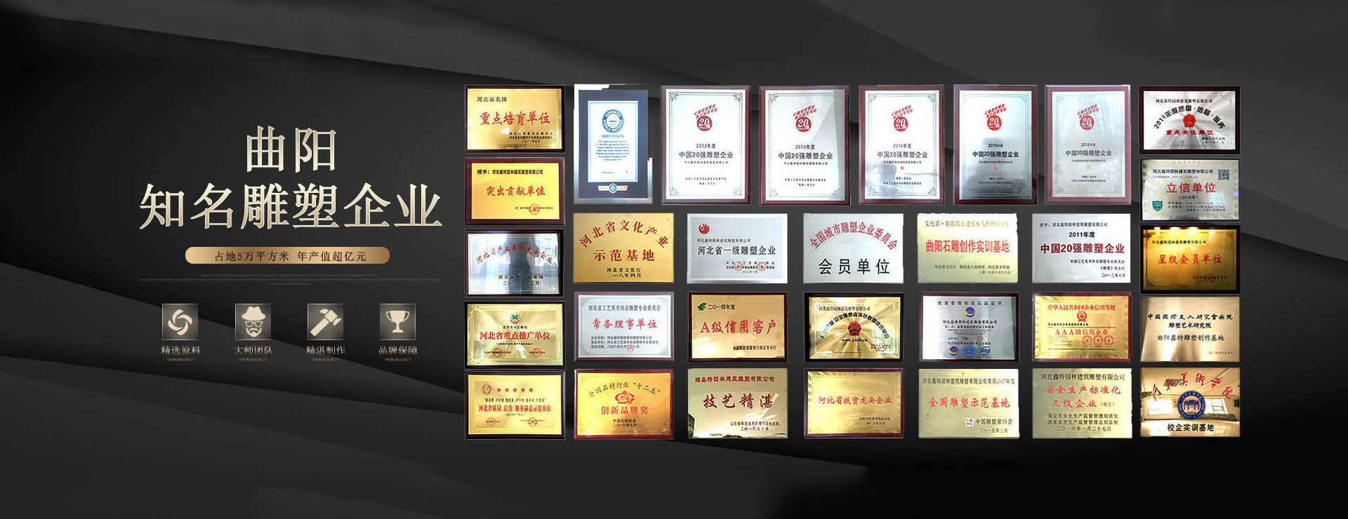 同時,公司也是行業(yè)內的佼佼者,連續(xù)七年榮獲“中國20強雕塑企業(yè)”,并被命名為“全國雕塑示范基地”,在國內外雕塑藝術領域享有較高聲譽。2017年,曲陽縣河北鑫特園林雕塑公司還被文化部、教育部、人社部命名為“中國非遺石雕傳承人群研培實訓基地”。